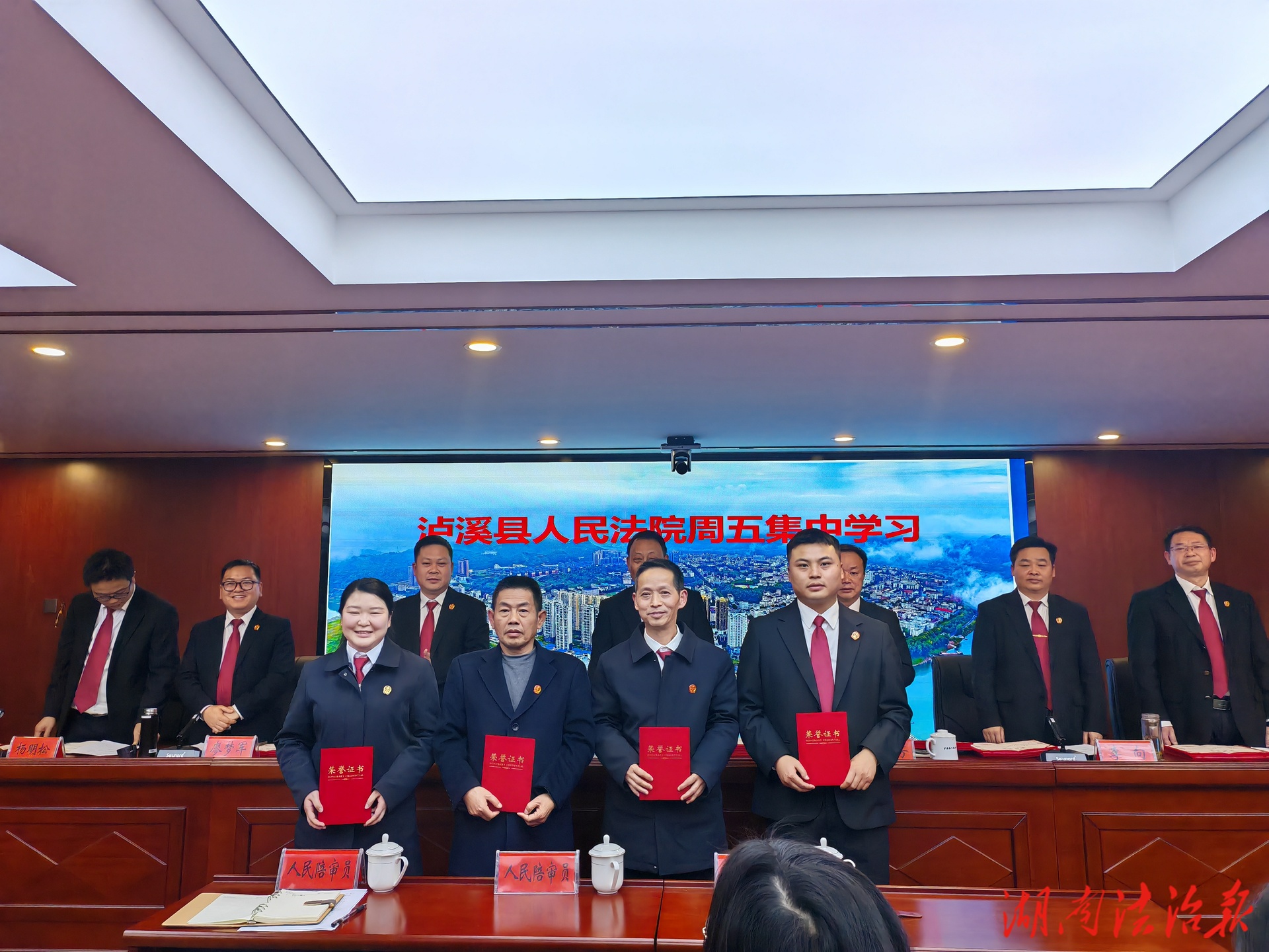 在莊重?zé)崃业姆諊?,?huì)議舉行了頒獎(jiǎng)儀式。院領(lǐng)導(dǎo)分別為榮譽(yù)天平紀(jì)念章獲得者及縣委、縣政府“嘉獎(jiǎng)”獲得者、司法績(jī)效能手、先進(jìn)個(gè)人、先進(jìn)集體及優(yōu)秀人民陪審員頒發(fā)紀(jì)念章、證書和獎(jiǎng)牌,向長(zhǎng)期奮戰(zhàn)在審判執(zhí)行一線、為法院發(fā)展作出突出貢獻(xiàn)的個(gè)人和集體致以崇高敬意?,F(xiàn)場(chǎng)掌聲不斷,榜樣力量深入人心。