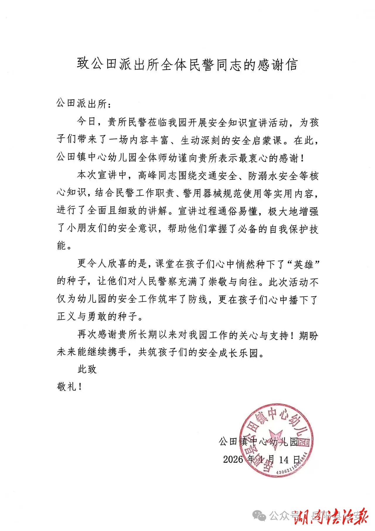 活動(dòng)結(jié)束后,公田鎮(zhèn)中心幼兒園全體師幼深受感動(dòng),專門向公田派出所發(fā)來(lái)感謝信。信中寫道:“高峰同志的宣講不僅在孩子們心中悄然種下了‘英雄’的種子,更讓他們對(duì)人民警察充滿了崇敬與向往。此次活動(dòng)不僅為幼兒園的安全工作筑牢了防線,更在孩子們心中播下了正義與勇敢的種子?!眻@方在信中表示,衷心感謝派出所所長(zhǎng)期以來(lái)對(duì)幼兒園工作的關(guān)心與支持,并期盼未來(lái)能繼續(xù)攜手,共筑孩子們的安全成長(zhǎng)樂(lè)園。